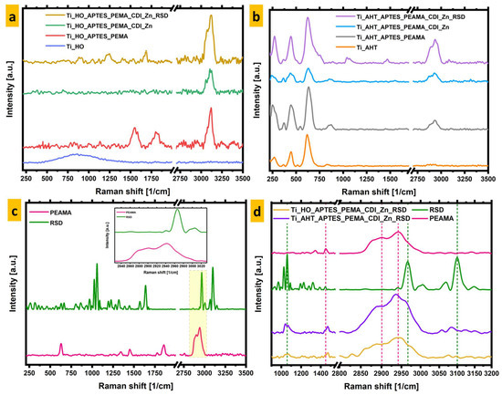 Raman spectra were also measured for the remaining modifications, which are summarized in Figure 6. In graph 6.c, the area enlarged and separated in the sub-graph is marked in yellow; additionally, in graph 6.d, the peaks for each tested material that were used for further analysis are marked with a dashed vertical line. In Figure 6a, all modifications for the HO group are summarized, and the same results for AHT are presented (Figure 6b). PEAMA and RSD bands (both substances in powder form) are shown in Figure 6c. For a clearer comparison of the results, the spectra for the Ti_HO_APTES_PEAMA_CDI_Zn_RSD and Ti_AHT_APTES_PEAMA_CDI_Zn_RSD samples with RSD and PEAMA are juxtaposed together, on a separate graph, for the range of 900–3200 cm−1. In Figure 6d, the characteristic peaks of raw substrates occurring on the modified titanium alloy surface are indicated by colored dashed lines. These are, respectively, for: RSD—1059 cm−1, 1450 cm−1, 2966.3 cm−1, 3010 cm−1 (green); PEAMA—1450 cm−1, 2901 cm−1, 2942 cm−1 (pink). For both modifications, peak characteristic of v(C-H)—2942 cm−1 and v(=(C-H))—3010 cm−1 bonds are clearly visible, indicating the presence of both polymer and drug on the surface. In the case of the bands at 1450 cm−1—v(CC) is in both cases shifted by several cm−1 on the modified surface. Comparing the data obtained with the SEM results, it can be concluded that similar results were obtained for both groups of modifications—as evidenced by the overlap in the occurrence of characteristic bands. Unfortunately, Raman mapping was not possible due to heating of the modified surfaces, which led to false readings of the intensity of a given band.