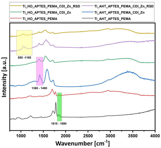 Surface mapping measurements were performed for six modifications—after etching in H2O2 and AHT, the silanization process, PEAMA layer formation, surface ionization with CDI, and after drug addition. Figure 7 compiles the spectra for each tested sample and marks the area on the basis of which the area under the graph was calculated and the maps were created. The band characteristics for a given compound were selected (range marked in the boxes), the presence of which does not coincide with others: for PEAMA, the analyzed range was 1815 cm−1–1890 cm−1; after Zn adsorption of the surface 1360 cm−1–1480 cm−1; after attaching the RSD 850 cm−1–1165 cm−1. Figure 8 shows the surface maps for (a) Ti_HO_APTES_PEAMA; (b) Ti_HO_APTES_PEAMA_CDI_Zn; (c) Ti_HO_APTES_PEAMA_CDI_Zn_RSD; (d) Ti_AHT_APTES_PEAMA; (e) Ti_AHT_APTES_PEAMA_CDI_Zn; (f) Ti_AHT_APTES_PEAMA_CDI_Zn_RSD. For each modification, a legend is shown for the value of the area under the plot to the baseline (as for Raman measurements). It is clearly visible that the samples subjected to the AHT process in the first step are characterized by a higher field value and thus the intensity of the bands. It can be assumed that in the final stage, after the addition of the RSD drug, there is much more of it than in the case of the surface etched in H2O2.