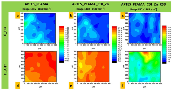 FTIR maps for samples (a) Ti_HO_APTES_PEAMA; (b) Ti_HO_APTES_PEAMA_CDI_Zn; (c) Ti_HO_APTES_PEAMA_CDI_Zn_RSD; (d) Ti_AHT_APTES_PEAMA; (e) Ti_AHT_APTES_PEAMA_CDI_Zn; (f) Ti_AHT_APTES_PEAMA_CDI_Zn_RSD.