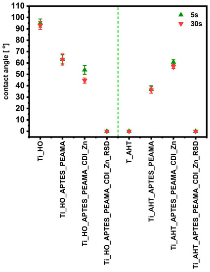 By juxtaposing the results of the contact angle measurements (Figure 9; samples divided into two groups by a green dashed line), the first significant difference can be observed after the formation of the -OH groups; the plates after immersion in the H2O2 solution are characterized by hydrophobicity, while the titanium alloy after AHT acquires fully hydrophilic properties. For each successive modification, changes in the values of the angles are observed, but they are opposite—for the Ti_HO, each successive modification decreases the wetting angle, where for the same modifications at AHT the opposite results (increasing hydrophobicity) were observed. It was also observed that only after the drug sorption step—RSD—the surface has the same character, hydrophilic, for both groups. The contact angle results for Ti_AHT are similar to those obtained during the 600 °C heating [30]. In contrast, the Ti_HO plate is distinguished by being more clearly and more intensely hydrophobic than it was in the case of the plate without etching. Due to various ways of preparing the surface for the tests and conducting the H2O2 etching process (various concentrations, with or without temperature) it is difficult to refer to the results of the available literature, but one thing is certain—mostly the plate prepared in this way is characterized by a contact angle above 20° [31,32].