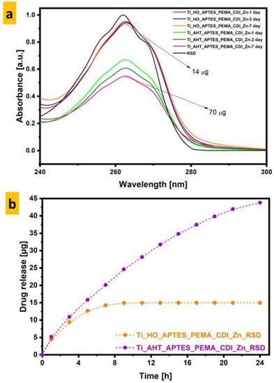 This is very important information because it allows us to assume that the surface of the endoprosthesis modified in this way could release the drug into the patient’s body gradually—several dozen hours after the operation. In addition, based on the UV-Vis results, we can assume that the surface preparation method—AHT—despite the fact that it is more resource- and time-consuming, has a more positive effect on the final effect than the more commonly used method of etching the surface by immersion in an H2O2 solution.