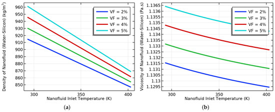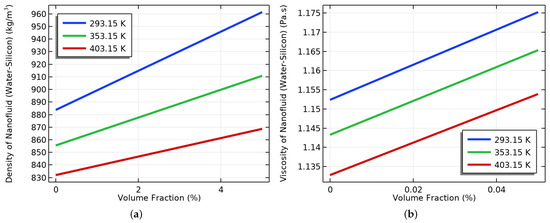 To solve Equation (13), the effective density and viscosity of the NF must be considered since it is a liquid composed of water and NPs. Over the years, several models have been proposed to predict oil production based on empirical correlations of the density and viscosity with various VFs. The proposed model is applicable over a wide range of temperatures and VFs and can be used to determine the density and viscosity of NF as a function of the VF and temperature. As a result, Equations (16) and (17) are utilized to calculate the density and viscosity as a function of the temperature and VF [45]. A novel model based on the density, viscosity, and TC of the NF is proposed to simulate the EOR process: