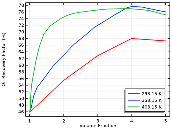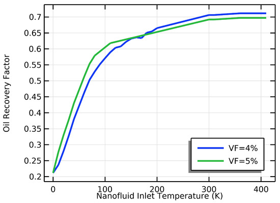 Al-Yaari et al. [38] conducted a study to optimize the use of NPs in enhancing oil recovery in a 3D PM. The authors examined the effects of different types of NPs, their VFs, and the inlet temperature on oil recovery efficiency. The results showed that SiO NPs exhibited the best ORF compared to other NPs. Interestingly, SiO also had the lowest density and the highest thermal capacity among the examined NPs. The authors found that the optimum volume fraction of SiO was 4%, which increased the ORF. However, the ORF decreased when the volume fraction exceeded 4%. Their findings also revealed that the ORF improved as the viscosity and density of the oil decreased, which was achieved by increasing the injected inlet temperature. Specifically, the highest ORF of 37% was obtained when SiO was used at a volume fraction of 4% and an inlet temperature of 353.15 K. These findings suggest that using SiO NPs at an optimal volume fraction and inlet temperature can significantly improve oil recovery efficiency in a porous medium. This highlights the importance of considering the thermophysical properties of nanoparticles when selecting an optimal nanofluid for enhanced oil recovery applications.
