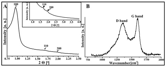 (A) The XRD diffractogram of the DF-CMK-3 carbonaceous material. (B) Raman bands for the DF-CMK-3 carbon.