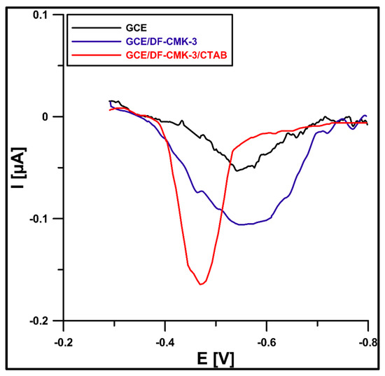 At the beginning of the research, the SWAdSV technique was applied to describe ROX (1 µM) behavior in 0.075 M acetate buffer (pH of 5.6) at the GCE (glassy carbon electrode), GCE/DF-CMK-3 (GCE modified with the DF-CMK-3 carbon), and GCE/DF-CMK-3/CTAB (GCE modified with the DF-CMK-3 carbon and CTAB). Figure 5 shows that the ROX signal at the GCE/DF-CMK-3/CTAB is 1.6 times higher than at the GCE-DF-CMK-3 and 3.1 times higher than at the GCE. Furthermore, the additional modification of the CTAB contributes to the improvement of the ROX signal shape. The increase in ROX signal due to the application of the DF-CMK-3 layer can be explained by the porosity and surface chemistry of carbon, which contribute to the improvement of the adsorption capacity of the electrode material. Moreover, further modification by the cationic surfactant, cetyltrimethylammonium bromide, resulted in a significant increase in the analytical signal that was observed due to electrostatic interactions between the cationic surfactant and the anion form of ROX in the solution with acidic pH [31].