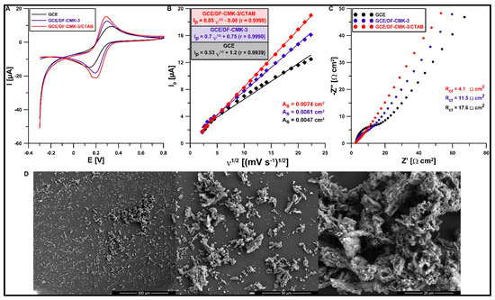 Another aim was to study the effect of the modification on the electrochemical properties of the electrode using cyclic voltammetry (CV) and electrochemical impedance spectroscopy (EIS). CV curves (ν from 5 to 500 mV s−1) and EIS spectra (f from 50,000 to 1 Hz and at a potential of 0.2 V) were registered in KCl solution (0.1 M) with the addition of K3[Fe(CN)6] (5 mM). Figure 6A shows the CV curves recorded at the GCE, GCE/DF-CMK-3, and GCE/DF-CMK-3/CTAB for ν of 500 mV s−1. Improvement of the Fe(II) oxidation signal and the relative separation of the oxidation and reduction peaks (χ0) were observed with the modification of the GCE surface. The χ0 values were 2.98, 1.74, and 1.41 for the GCE, GCE/DF-CMK-3, and GCE/DF-CMK-3/CTAB, respectively, which indicates better electron transfer kinetics for the GCE/DF-CMK-3/CTAB, where χ0 is closer to the theoretical value (χ0 = 1). Based on the obtained CVs, the relationship between the anode peak current (Ip) and the square root of ν was studied (Figure 6B). On the basis of these results, the active area (As) of both electrodes was calculated using the Randles–Sevcik equation [42]. The obtained results showed an increase in the As of the GCE/DF-CMK-3/CTAB compared to the GCE/DF-CMK-3 and GCE (0.074 vs. 0.061 cm2 and 0.074 vs. 0.047 cm2, respectively). Figure 6C shows the EIS spectra where the GCE/DF-CMK-3/CTAB has a lower charge transfer resistance (Rct) than the GCE/DF-CMK-3 and GCE (4.1 vs. 11.5 Ω cm2 and 4.1 vs. 17.6 Ω cm2, respectively). Figure 6D displays the SEM images of the GCE/DF-CMK-3 surface morphology. As can be seen, the GCE surface is covered with carbon particles of various sizes. Moreover, the worm-like morphology of the particles is partially deformed, which can be the result of the thermochemical modification with sodium diclofenac.