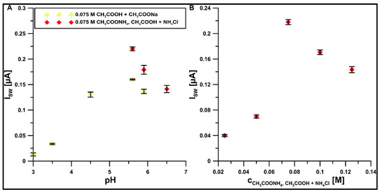 The impact of (A) type and pH value, and (B) concentration of the electrolyte on the 1 µM ROX. Other parameters are as in Figure 6.