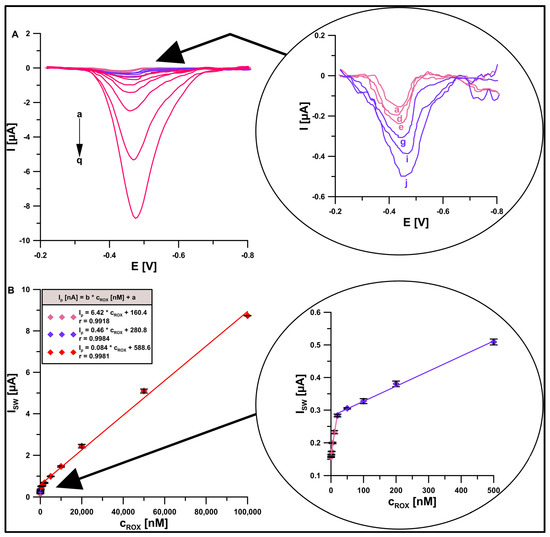 (A) SWAdSV curves at the GCE/DF-CMK-3/CTAB in 0.1 M buffer solution (CH3COONH4, CH3COOH, and NH4Cl) of pH = 5.6, 40 mg/L CTAB, and ROX (a→q, 0.0005, 0.001, 0.002, 0.005, 0.01, 0.02, 0.05, 0.1, 0.2, 0.5, 1, 2, 5, 10, 20, 50, 100 µM). (B) Linear calibration plots of ROX. The procedure parameters: t = 90 s, f = 200 Hz, ESW = 75 mV, and ΔE = 6 mV. The SD was calculated for n = 3.
