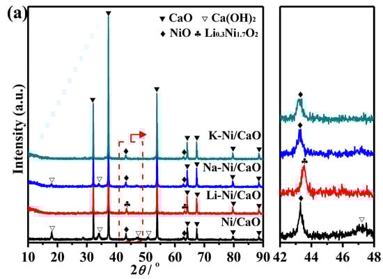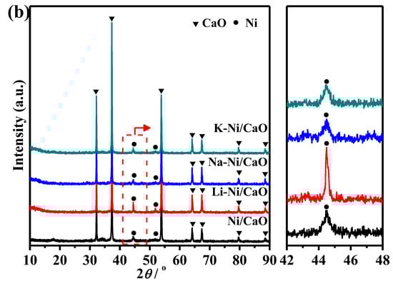 Figure 1a includes the XRD patterns of the calcined Ni/CaO modified with alkali metals (Li-Ni/CaO, Na-Ni/CaO, and K-Ni/CaO) and Ni/CaO. Intense and narrow diffraction peaks at around 32.2°, 37.3°, 53.9°, 64.2°, and 67.4° could be observed for all the prepared materials, which are characteristic of highly crystalline CaO with a cubic structure [33]. The weak peaks around 18.1° and 34.1° are characteristic of Ca(OH)2, which is related to the existence of moisture. Furthermore, small diffraction peaks at 43.3° and 62.8° are ascribed to the characteristic peak of NiO. The addition of Na and K did not give rise to new crystalline phases, indicating that alkali metals were present in an amorphous and/or highly dispersed state, and the crystalline structure of the CaO remained unchanged, but a slight decrease in the intensity of the characteristic diffraction peaks of NiO was observed for Na-Ni/CaO and K-Ni/CaO compared with Ni/CaO, which is attributed to the stabilization of metal particles caused by the doping of alkali metals [34,35]. However, a new peak with higher crystallinity attributed to Li0.3Ni1.7O2 was detected for Li-Ni/CaO [36].