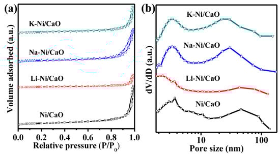Regarding textural properties, Figure 2 shows the N2 adsorption–desorption isotherms and pore size distributions for the reduced DFMs. All of them exhibited a type-IV isotherm and an H3-shaped hysteresis loop, which are characteristic of slit-shaped pores formed by the decomposition of the citric acid complex and carbonated species. As shown in Table 1, the addition of alkali metals to Ni/CaO resulted in a slight decrease in the specific surface areas to 12.6 and 12.2 m2/g for Na-Ni/CaO and K-Ni/CaO, respectively, whereas these DFMs maintained comparable pore volumes as well as average pore sizes. As for Li-Ni/CaO, the specific surface area, pore volume, and average pore size dramatically decreased to 5.9 m2/g, 0.04 cm3/g, and 19.8 nm, respectively, due to the pore structure blockage caused by the large Li0.3Ni1.7O2 particles. The larger specific surface area of DFMs is believed to correlate with high CO2 capture capacity [39]. In addition, Figure 2 shows that Na-Ni/CaO and K-Ni/CaO maintained bimodal pore size distributions with mesopores in the range of 2–5 nm and macropores in the range of 20–100 nm, which was similar to the pore structure of three-dimensional networks consisting of meso- and macropores with excellent elasticity and stability for Ni/CaO, as previously reported [30,31]. Meso- and macropores are responsible for CO2 uptake and diffusion control, respectively [40].