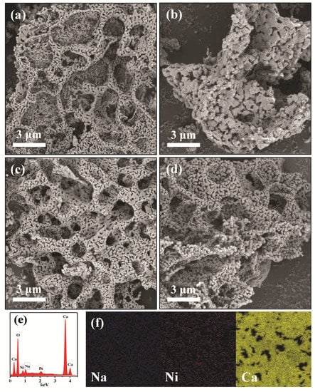 SEM images of (a) Ni/CaO, (b) Li-Ni/CaO, (c) Na-Ni/CaO, (d) K-Ni/CaO DFMs, and (e) EDX and (f) elemental mappings of Na-Ni/CaO DFM.