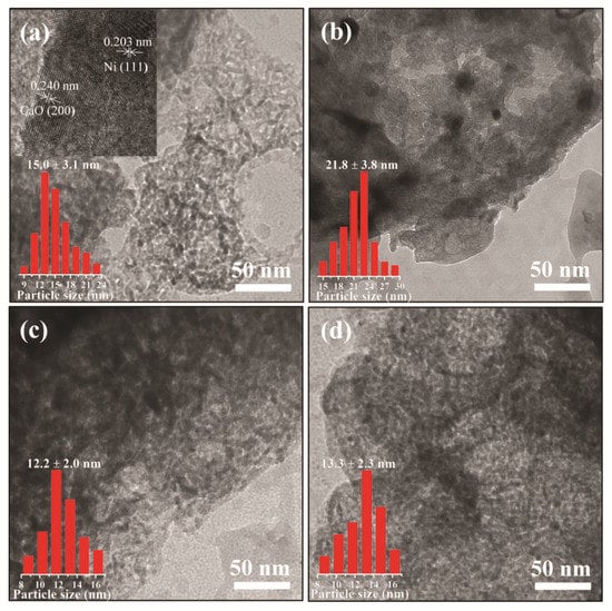 To investigate the effect of alkali metal doping on the morphology and particle size of the reduced DFMs, SEM/EDX and TEM were conducted. As shown in Figure 3a–d, the Ni/CaO DFMs prepared via a facile precipitation–combustion method exhibited a three-dimensional network with porous morphology, which was composed of CaO particles ranging in size from 50 to 100 nm. The porous morphology was maintained very well after doping with alkali metals, including Na and K. However, it was noticed that the porous structure of Li-Ni/CaO partly collapsed, which agreed with the obvious decrease in specific surface areas. Additionally, SEM-EDX analysis was conducted to explore the distribution mappings of Na, Ni, and Ca elements in Na-Ni/CaO (Figure 3e,f). As could be observed, Na (blue color), Ni (red color), and Ca (yellow color) elements coexisted with a homogeneous distribution in all the analyzed areas, indicating their good dispersion. From the TEM image of Ni/CaO (Figure 4a), some dark crystal particles were observed with a mean size of ca. 15 nm distributed on the surface, where the lattice distance of 0.203 nm could be clearly seen and represented the lattice plane (111) of the metallic Ni phase [41]. After doping with alkali metals, the average sizes of Ni nanoparticles on the Li-, Na-, and K-Ni/CaO DFMs varied as 21.8 ± 3.8 nm, 12.2 ± 2.0 nm, and 13.3 ± 2.3 nm (Figure 4b–d), respectively, which was consistent with the XRD results (Table 1), suggesting that the introduction of Na or K into Ni/CaO DFMs certainly help to uniform and stabilize Ni particles to achieve the expected catalytic activity.