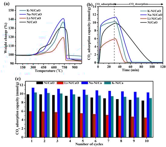 The temperature of CO2 capture in the DFMs was tested using the TGA technique under a simulated gas of 10 vol% CO2/Ar over a wide temperature range of 50 °C to 1000 °C (Figure 6a). It could be observed that the weight of the as-prepared DFMs remarkably increased in the temperature range of 550–700 °C, in which CO2 chemisorption could be activated to allow diffusion processes throughout the bulk of the materials. The carbonated CaO and alkali-metal-modified CaO were completely regenerated, with a sharp decrease in weight occurring at 740–800 °C, which corresponded to the decomposition of CaCO3. This suggested that all DFMs exhibited good CO2 capture capacities at temperatures between 550 °C and 700 °C. Furthermore, at 550, 600, 650, and 700 °C, the CO2 isothermal capture capacities and adsorption rates of all DFMs increased with temperature and reached the maximum level at 650 °C (Figure S1 and Table S2).
