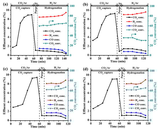 The carbon balance of the DFM was defined as the ratio between the total yields of CO2 and CO in the hydrogenation stage and the CO2 capture capacity in the capture stage. It was calculated that the carbon balances of all the DFMs were calculated to be higher than 90%, indicating that nearly all of the captured CO2 in the capture stage was subsequently released as CO and CO2 during the hydrogenation stage.