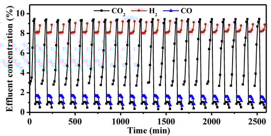 Twenty cycles of integrated CO2 capture and hydrogenation of the Na-Ni/CaO DFM. Temperature: 650 °C; GHSV: 6000 mL·g−1·h−1.