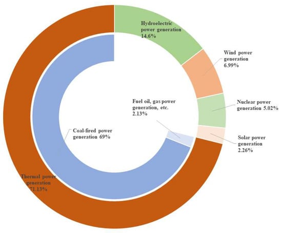 China is the world’s largest producer of coal and electricity. As of 2021, China’s power energy structure was still dominated by thermal power generation, with coal-fired power generation as its main component (Figure 1). The large output of coal and the large-scale application of coal-fired power result in a large amount of coal-based solid waste generation in China every year. According to the statistics, the annual output of coal gangue and fly ash in China currently exceeds 700 million tons. The discharge and accumulation of a large amount of coal-based solid waste have caused great harm to the ecological environment [1].