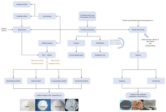 There are three main methods for the recycling and utilizing of coal gangue and fly ash by preparing Si-based porous materials [33]: (1) extracting valuable elements from coal gangue and fly ash through various physicochemical methods to achieve the reproduction of porous materials; (2) mixing coal gangue and fly ash with other active substances to produce porous materials; (3) directly modifying the solid waste based on its inherent characteristics to produce porous materials. The specific processes are shown in Figure 2.