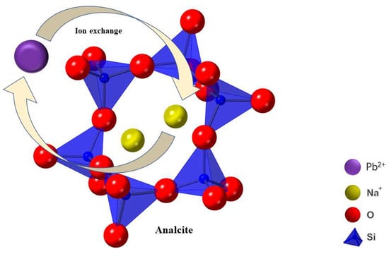 Li et al. [47] created an analcite-activated carbon composite from coal gangue and investigated its adsorption mechanism of Pb2+ (Figure 3). The research showed that the specific surface area of analcite-activated carbon composite was 20.8202 m2/g. It could rely on ion exchange to adsorb Pb2+ with a maximum adsorption capacity of 125.57 mg/g. Ankrah et al. [52] used fly ash to synthesize mesoporous NaP1 zeolite and achieved the adsorption of multiple metal ions such as Zn2+, Cu2+, and Pb2+. Besides metal ions, NH4+ in wastewater can also be adsorbed similarly. By mixing fly ash, red mud, and coffee grounds with water, a slurry was shaped and sintered into ceramsite. Then, making the NaP zeolite crystallized on the surface of the ceramsite by hydrothermal treatment with NaOH and NaAlO2 at 373 K for 24 h, a hierarchically porous NaP zeolite composite was obtained with an NH4+ adsorption capacity of 13.1 mg/g at 318 K [53]. Chen et al. [54] used a hydrothermal method to convert fly ash into highly porous converted CFA, with X-zeolite as the main active phase. Through adsorption experiments, it was found that this material’s maximum adsorption capacity for NH4+ was 138.89 mg/g.