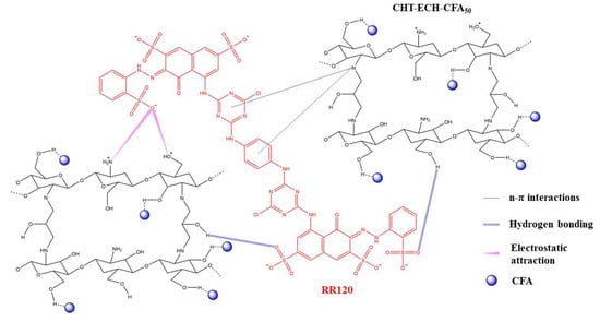 Interaction between CHT-ECH/CFA50 surface and RR120 dye: electrostatic attraction, hydrogen bonding interaction, and n-π interaction [57].