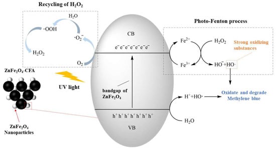 Photo-Fenton technology is a technique that employs photocatalysis to assist the Fenton reaction. Compared to traditional Fenton processes, photo-Fenton technology possesses the advantages of both, and it is more effective in treating organic pollutants. Nadeem et al. [67] added hydrothermally treated coal fly ash (CFA) into a ZnFe2O4 precursor solution and synthesized ZnFe2O4-CFA composite Fenton-like catalysts through hydrothermal synthesis. SEM-EDS analysis shows that the surface of composites is very rough and the zinc ferrite is uniformly loaded, making it a photo-Fenton catalyst with good adsorption performance. Figure 7 illustrates the mechanism flowchart of ZnFe2O4-CFA composite degrading methylene blue dye under UV light. ZnFe2O4 generates h+ and e− under UV light, where h+ reacts with H2O to form H+ and OH· while e− forms Fe2+ with Fe3+. The resulting Fe2+ undergoes a Fenton reaction with H2O2 to form OH−and OH·. The formed OH· will oxidize and degrade methylene blue due to its strong oxidizing property. In addition, the O2 produced during the reaction generates superoxide anions (·O2−) with e−, which further oxidize into H2O2, achieving the recycling of H2O2 (Equations (6)–(10)):