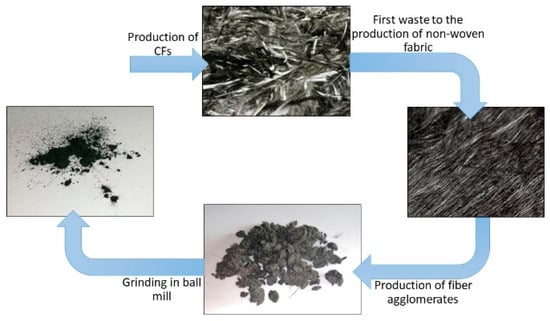 Such a boost in the use of CFs affects the generation of wastes that derive both from the production process (process wastes representing about 30–40 wt.% of the total) and from the end of life of the products [1]. Currently, the main ways for the disposal of composite waste are incineration and landfilling, but these strategies will no longer be adequate due to environmental pollution and loss of CFs with high added value [2]. Recently, several recycling technologies have been proposed to treat composite materials with CFs and recover the CFs to reuse them in other applications for both economic and environmental reasons, aiming at the production of sustainable composites made with recycled reinforcement and a recyclable matrix [4]. The main technologies explored so far include mechanical recycling (shredding, crushing, milling), chemical recycling (solvent, catalyst, or supercritical fluids), and thermal recycling (pyrolysis, oxidation, steam thermolysis), and the objective of these techniques is to recover CFs under conditions as close to their initial state as possible to facilitate reuse in other applications [5]. Mechanical recycling is currently one of the consolidated methods and involves several steps to reduce the size of waste. First, the composites are ground to a size of about 50–100 mm, and then, further grinding is applied to obtain recycled materials with different dimensions, which can range from powder to fibrous agglomerates. The materials obtained from this type of recycling can be used as reinforcement in short-fiber composite materials, such as those used for extrusion and injection molding. Because of the resultant limited fiber aspect ratio, these materials have a low market value [6]. Due to the friction caused by materials during recycling, damage to equipment can occur, which directly increases the cost of various operations, and this decreases the economic margin of recycled materials, often making this choice less feasible. Dust produced by the recycling system is a major safety and health hazard, but it can be easily reduced with engineering controls and good ventilation [1,6]. In the case of chemical recycling, called solvolysis, the polymeric matrix is decomposed with a solution of acids, bases, and solvents whose composition must be adjusted according to the nature of the matrix. To increase the contact surface with the solution and aid in the dissolution of the matrix, solid composites are ground first. At the end of the process, the CFs are washed to remove the decomposed polymer residues and the solvent residues.