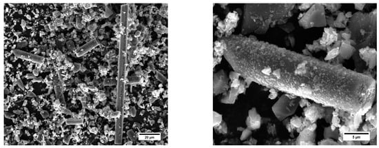 The physical properties and chemical composition of these microfibers were obtained experimentally. Their density was determined using a helium pycnometer (ASTM UOP851) and was found to be 1.917 g/cm3. Subsequently, scanning electron microscopy (MIRA 3 FEG-SEM, TESCAN, Brno, Czech Republic) and energy-dispersive spectroscopy (Octane Elect EDS system, Edax, Mahwah, NJ, USA) analyses of the microfibers were carried out to study their morphology and elemental composition. As can be seen in Figure 2, the sample was characterized by numerous fragments of CFs with a varied granulometry and a predominant fraction of pulverulent material, due to the ball milling process to which the raw materials were subjected.