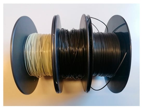 In all cases, the diameter of the filaments was periodically checked during the winding phase to be sure that it fell within the dimensional range allowed for feeding to the 3D printer, i.e., a diameter between 1.60 and 1.80 mm, with an optimum of 1.75 mm [19,20]. The filaments’ diameters were measured using a digital caliper (sensitivity of 0.05 mm). Figure 4 illustrates the PA6,6 filaments obtained from the extrusion process.