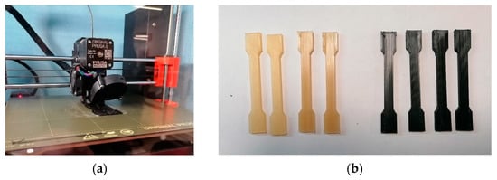 After the in-depth study of the properties and characteristics of the 3D printing filaments, the 3D printing of dumbbell-shaped samples with the three formulations chosen was carried out in order to perform tensile tests. The machine used was a PRUSA i3 3D printer (Prusa, Prague, Czech Republic) (Figure 5a). The standard dumbbell-shaped specimens were 7 mm × 3 mm, with a useful length of 45 mm, with curved fittings and no perimeter (Figure 5b). As far as the operating temperatures are concerned, a printing temperature of 265 °C and a bed temperature of 90 °C were used for the neat PA6,6 and 5 wt.% rCF specimens, while for the 10 wt.% rCF specimens, a printing temperature of 270 °C and a bed temperature of 110 °C were used. A printing speed of 40 mm/s, 100% infill percentage, an aligned rectilinear pattern, and a layer height of 0.2 mm were set for all three families. Before printing, filament spools were dehumidified in a drying oven for 24 h at 80 °C.