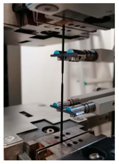 The filaments were tensile-tested with a Zwick/Roell universal testing machine (Z010, load cell: 10 kN, preload: 10 Mpa, Ulm, Germany) with a crosshead speed of 20 mm/min and a gauge length of 30 mm. Before carrying out the test, filament specimens (length of 150 mm) were conditioned in an oven at 80 °C for at least 24 h to avoid problems related to the moisture absorption tendency of the PA6,6 matrix. For each formulation (neat PA6,6, PA6,6 + 5% rCF, and PA6,6 + 10% rCF), 5 filament samples were tested.