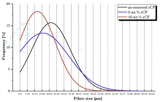 Figure 10 plots the fiber size distribution for as-received rCFs and fibers from the two composite samples. As expected, the average fiber length reduced following extrusion, due to the breakage that rCFs experienced during processing. Moreover, the greatest dimensional reduction occurred in the sample loaded with a higher rCF volume fraction. The mean fiber length was reduced by 23% and 37% in PA6,6 composites incorporating 5 wt.% and 10 wt.% of CFs, respectively. This trend was predictable and is justifiable due to the brittle behavior of carbon fibers. During the extrusion process, the melting of the polymer in twin-screw extrusion requires a large energy input, generates high local stresses and strains, which are detrimental to the fiber’s dimensions [27]. In addition, a higher fiber content leads to a higher damage to the fiber size. The increased deterioration of fiber length for a higher rCF volume fraction is mainly attributed to the higher fiber–fiber interaction [28]. As the percentage of fibers added inside the dosing hopper increases, the stresses due to the interaction with the neighboring fibers also increases, enhancing breakage phenomena.