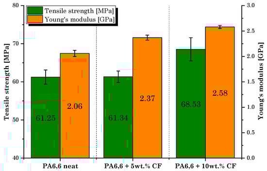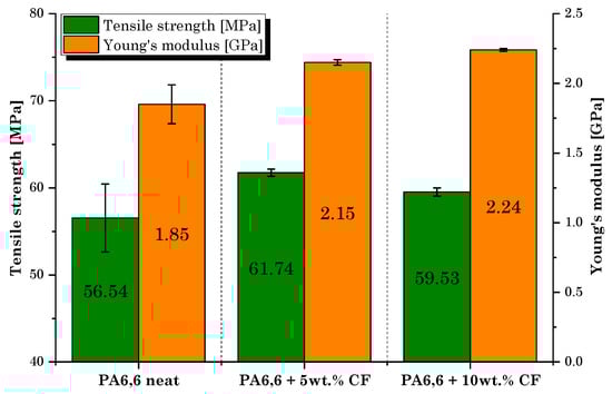 The tensile test results are shown in Figure 11. As expected, the addition of rCFs resulted in an increase in Young’s modulus and tensile strength values. Compared to the neat PA6,6 filament, the best performance was obtained for the composite specimens incorporating the highest fiber content (PA6,6 + 10 wt.% rCF), resulting in an increase up to 25% and 11% in the elastic modulus and strength, respectively. It is widely known that implementing reinforcing materials (such as CFs) for designing 3D-printable polymer composites overcomes the strength limitations of FDM-fabricated pure thermoplastic parts, while improving the functionality and applicability of the material [16]. The filaments produced in this work show promising mechanical performance when compared with similar commercial products obtained from virgin microfibers. For instance, the study conducted by Al-Mazrouei et al. [29] involved the use of a commercial 3D-printable nylon/CF filament (20 wt.% CF) having a declared tensile strength and Young’s modulus of 66.3 MPa and 2.76 GPa, respectively.