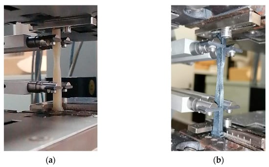 3D-printed composite specimens during tensile tests: (a) PA6,6 neat and (b) PA6,6 composite.