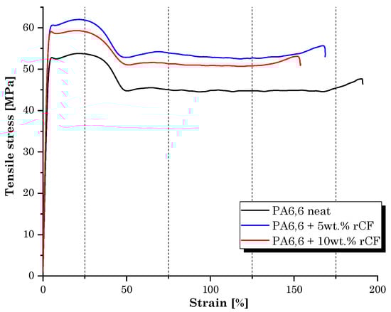 The stress–strain curves (Figure 14) of the neat PA6,6 sample and the PA6,6-CF composites clearly elucidate that the addition of carbon microfibers preserved the ductile behavior of the neat matrix. The stiffening induced by the rCF addition slightly reduced the elongation at break of the composites, ranging between 150% (10 wt.%. rCF) and 170% (5 wt.% rCF).