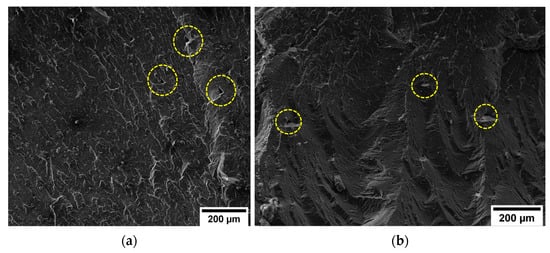 SEM micrographs (magnification 500) of (a) PA6,6 + 5 wt.% rCF and (b) PA6,6 + 10 wt.% rCF specimens. The dotted circles highlight inter-filament voids in the matrix.