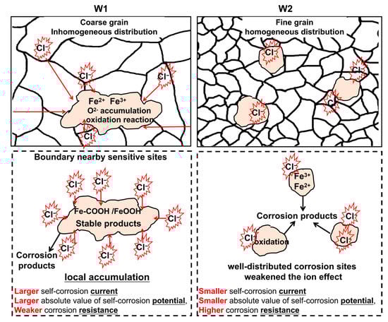 - When the O and Cl− adsorbed and accumulated in local areas in the corrosion products of the weld microzones, these elements induced an inhomogeneous response, while a less severe corrosion response in zones after the post-weld heat treatment which were relieved with a compact and thick corrosion product layer.