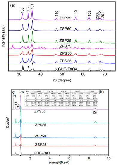The element composition of some samples was determined by the EDS technique (Figure 1b), confirming the presence of organic compounds in the synthesized ZnO NPs. The CHE-ZnO sample only consisted of Zn and O; however, in all the PLE-doped ZnO NPs samples C and N were present in different concentrations. Depending on the different synthesis processes, the ratio of C and N in the product was different: the C content in the product which was synthesized following the first process (ZPS) was higher than those synthesized by the second process (ZSP); however, the N content was in reverse. It means that, in the different reaction order, the various organic compounds (in the PC extract) interacted with different reactants (ZnO·H2O or Zn2+) or bi-modified during reactions 5 and 6 and attacked the ZnO structure. It led to the formation of ZPS and ZSO, which differed in surface organic composition and properties (bioactive). The common point is that as the amount of used extract increased, the content of C and N in the product increased.