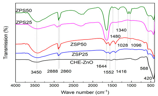 The potential interactions between biomolecules and the surfaces of ZnO nanoparticles were investigated by using Fourier transform infrared spectroscopy (FTIR), at a wave number band of 4000–400 cm−1, as shown in Figure 2.