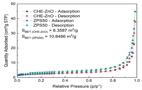 The nitrogen absorption–desorption experiments of the CHE-ZnO and ZPS50 NPs are recorded in Figure 4. The linear isotherm plot was the intermediate form between type II and III [39]; the mean pore diameters of CHE-ZnO and ZPS50 NPs were 47.2652 nm and 33.7243 nm, respectively, which indicated both CHE-ZnO and ZPS50 NPs samples were the mesoporous structure. The uptake of N2 was initially slow, and until the surface coverage was sufficient, the interactions between adsorbed and free molecules began to dominate the process. The BET surface areas of the CHE-ZnO and ZPS50 NPs samples were 8.3587 m2/g and 10.8486 m2/g, respectively. This result confirms the reduction in grain size of ZPS50, compared with the CHE-ZnO particles.