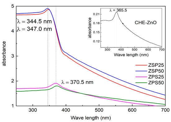 The optical properties of the synthesized ZnO NPs were analyzed through the UV-VIS DRS technique, and the results are illustrated in Figure 5. The UV-Vis DRS spectrum of the CHE-ZnO NPs manifested a strong absorption peak at 366.5 nm, with minimal absorbance in the visible region (see inset of Figure 5). All the PLE-doped ZnO NPs samples had a greater intensity of absorbance than the CHE-ZnO NPs. Compared to the CHE-ZnO NPs, the ZPS samples demonstrated a slight red-shift of the highest absorption peak from 366.5 to 370.5 nm. This trend was additionally found in the previous works [25,40,41]. The absorbance intensities of the ZSP samples were higher than those of the ZPS samples, and the absorption peaks were shifted to a smaller wavelength, approximately 344.5 to 347.0 nm. This observation suggested that the reaction order of the Zn2+ solution influenced the structure and surface properties of the synthesized PLE-doped ZnO NPs, P. chaudocanum L. extract, and alkaline solution, which altered the optical properties of the materials. The high absorbance intensity was good; however, the absorption peak of the ZSP NPs at smaller wavelengths (344.5 to 347 cm−1, compared to 366.5 cm−1 of the CHE-ZnO NPs) additionally meant a larger energy band gap, and they were more challenging to activate in the region of visible light. In contrast, the absorbance intensities of the ZPS NPs were smaller, and the absorption peak shifted to a larger wavelength (370 cm−1), decreasing the energy band gap. In addition, the absorbance intensities of the ZPS NPs were smaller than the ZSP NPs however much higher than the CHE-ZnO NPs. As a result, the ZPS NPs would be more active and beneficial for bioactivity in the region of visible light [42].