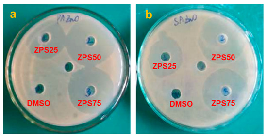Antibacterial activity of ZPS25, ZPS50, and ZSP75 samples and DMSO solvent against (a) P. aeruginosa and (b) S. aureus.