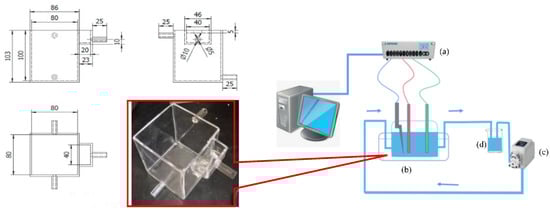 Figure 1 depicts the circulating flow–electric field cementing apparatus used in this work. The electrolytic cell was built from acid-resistant transparent acrylic glass with two upper and lower water inlet and exit pipes on both sides, and multiple circulation configurations were configured depending on the electrolyte flow direction. The combination of six circulating flow directions could be designed by pressing the flow direction of higherH, lowerL, cathode C, anode A, and electrode side S: H-AC-L, L-AC-H, H-CA-L, L-CA-H, LSH, and HSL. A design flow rate of around 1–30 mL/s was applied to the electrolyte circulation, which was governed by the inflow rate and total inlet area. The peristaltic pump’s input and outlet were connected to a 500 mL electrolyte storage tank, and the electrolyte was collected from the discharge outlet, mixed, and circulated.