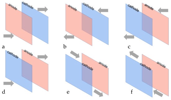 Type of flow field configuration (a) LACH; (b) HCAL; (c) HACL; (d) LCAH; (e) HSL; (f) LSH.