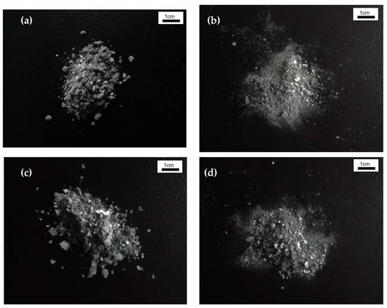 Four sets of samples were extracted to compare the morphology of the cadmium sponge. Following the linked circulating flow–electric field, three samples were recovered from the anode surface, cathode surface, and cell bottom. One batch of samples was extracted using the standard zinc powder cementation method. Surface examination revealed that all four groups of samples were greyish-white sponge metal powder (Figure 3). The presence of microscopic granular structures in the zinc powder sponge cadmium sample in Figure 3a, as well as flakes in the anode surface sample in Figure 3b and the bottom of the cell sample in Figure 3c, was the variation. Figure 3d shows that none of these structures were present in the cathode sample. These shapes represent electrode surface zinc flakes scraped off with the cadmium sponge. All four sets of samples were analyzed with ICP main components to confirm this hypothesis, and the findings are reported in Table 3.