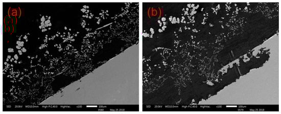 Two conclusions can be drawn from the comparison of the ICP results shown in Table 3. One is that the process of using zinc powder to cement the cadmium resulted in a significantly higher zinc content in the sponge cadmium. Secondly, the composition ratios from the anode surface and cell bottom samples were very close, which can be determined because almost all of the sponge cadmium at the cell bottom was shed from the anode surface during the reaction. The samples were first collected using a filter paper funnel. They were then rinsed three times with 1 L of deionized water and further dried in a vacuum oven at 60 °C before being collected. The SEM results are shown in Figure 4.