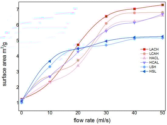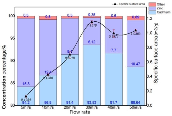 Concentration percentage (%) and specific surface area (m2/g) of cadmium sponge at different flow rates (mL/s).