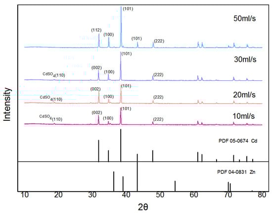 Firstly, the purity and specific surface area of the cadmium sponge at different flow rates were tested for comparison, and the results are shown in Figure 7. The purity of the cadmium sponge increased with the increase in flow rate. At a flow rate of 30 mL/s, the purity of the cadmium sponge reached a maximum of 94.93%, and then gradually decreased. Presumably, the decrease in the purity of the cadmium sponge might have been due to two factors: One is that an excessively high flow rate led to the stripping of the larger zinc on the anode surface together with the cadmium sponge into a precipitate. The other is the possible generation of alkaline zincate during the reaction. To test this speculation, the sponge cadmium was characterized by XRD and the results are shown in Figure 8. No alkaline zincates appeared in the process of cementation by comparison with the related literature studies [23,24]. Compared to other flow rates, the XRD pattern at 50 mL/s showed new peaks at 43° and 70°. This is actually one of the characteristic peaks of ZnO, which formed when the high flow rate led to the tearing of the zinc anode lamellar structure and some of the zinc entered the cadmium sponge, which was then oxidized. A small amount of incompletely washed zinc sulfate salt, on the other hand, exhibited a peak at 70°. The comparison revealed a gradual disappearance of the weak peaks near 19° 2 theta as the flow rate increased. Combined with the standard card (PDF15-0086), it is obvious that this is a characteristic peak of cadmium sulfate. The disappearance of this peak is primarily attributed to the incomplete reaction when the flow rate was slow, and the traces of residual cadmium sulfate in the cadmium sponge sample. As the flow rate increased, the reaction was more complete, resulting in no more residual cadmium sulfate in the cadmium sponge sample. Accordingly, the specific surface area of the cadmium sponge also peaked at a flow rate of 30 mL/s, as can be seen in Figure 9. This demonstrated that excessively high flow rates were not conducive to the high-purity extraction of the cadmium sponge, and that the relatively loose morphology of the cadmium sponge was more easily self-exfoliated in the presence of the flow field, resulting in less zinc stripping.