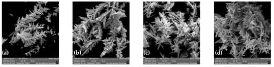 Furthermore, the cadmium sponge was collected at various flow rates and morphologically compared under electron microscopy, as shown in Figure 9. The cadmium sponge morphology showed a dense state at low flow rates and was looser at high flow rates. The reason why the flow rate affected the sponge cadmium particles is speculated as follows: when the flow rate was low, the local microscopic concentration polarization led to higher cadmium overpotential, and the nucleation rate was larger than the nucleation growth rate, so the sponge cadmium particles formed were denser [25,26]. On the other hand, when the flow rate increased, the growth rate of nucleation was higher than the rate of nucleation, resulting in the formation of looser sponge cadmium particles. The growth of the lateral branches of the cadmium sponge crystal branches were seen to be significantly stronger than the main branches as the flow rate rose [27,28,29,30]. This was presumably attributed to the growth process of the crystals being stronger than the nucleation process due to the increase in flow rate, which further demonstrated that the increase in flow rate facilitated the modulation of the spongy morphology of the cadmium sponge.