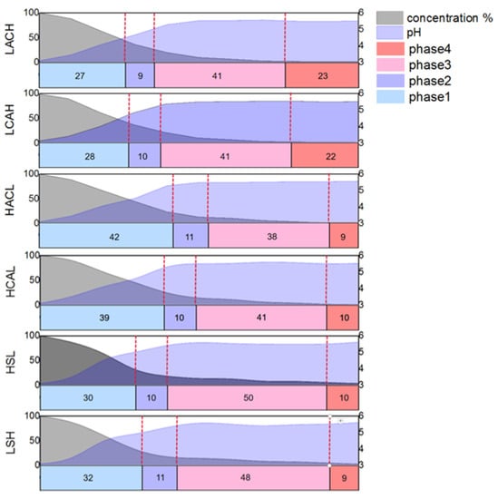 Comparative studies were performed with six distinct circulation configurations at a 30 mL/s flow rate to assess the influence of different flow field modes on the cementation process in the device. How the electrolytes are cycled affects the formation and exfoliation times of sponge cadmium. Additionally, pH and cadmium concentration variations can confirm whether the four reaction phases are accelerated or delayed. As shown in Figure 10, LACH and LCAH were the first two to enter the second phase in the six flow field configurations, owing to the turbulence in the up and down flow directions prompting earlier shedding of the cadmium sponge. For LACH, the first and second phases were completed more quickly than for LCAH, presumably due to the flow field direction from anode to cathode facilitating a greater diffusion of zinc ions and reducing concentration polarization to improve reaction efficiency. For similar reasons, the final cadmium extraction rates obtained for HSL and LSH were not improved compared to the other four configurations, but the reaction rate was still somewhat improved relative to HCAL and HACL. The reason for this was the absence of a barrier that restricted the fluid in the electrode plate. The flow direction towards the side was more conducive to the faster spread of ions in the electrolyte.