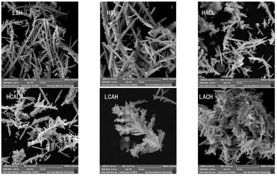 In order to confirm the findings from the previous section, we analyzed the morphology of the cadmium sponge using electron microscopy and measured its specific surface area for six different flow field configurations. These comparisons are illustrated in Figure 11 and Figure 12. It was easily found that the morphological variations of the cadmium sponges produced under different flow field configurations were mainly in terms of the dendrite development degree and specific surface area. The sample morphologies of LACH and LCAH exhibited abundant side crystal branches and dense cluster structures. When considering the information presented in Figure 12, it becomes evident that the specific surface area of LACH and LCAH exceeded that of the other four groups. Meanwhile, the specific surface area of LSH and HSL was the smallest, and their crystal branching displayed thicker main crystal branches. This confirmed the speculation in the previous section about the faster local ion diffusion in the transverse flow field.