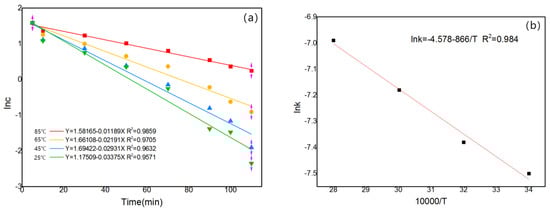 (a) Kinetic curve at 25 °C, 45 °C, 65 °C and 85 °C; (b) lnk vs. 10,000/T.